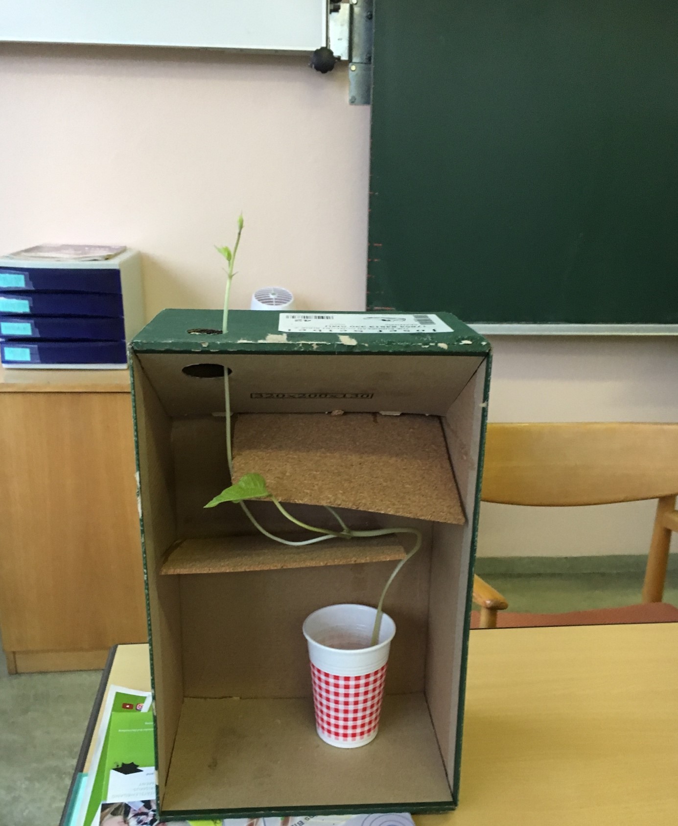 Dazu wurden in einem Schuhkarton Zwischenwände eingesetzt, eine Bohne angepflanzt und der Karton verschlossen.